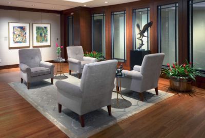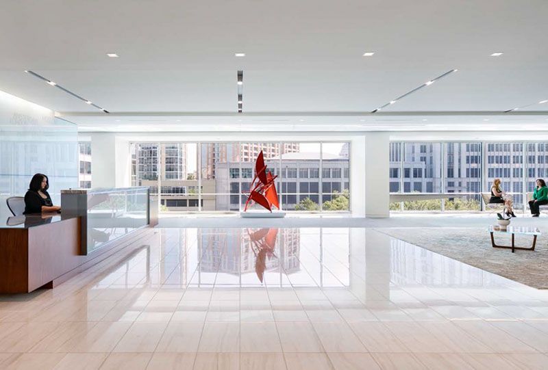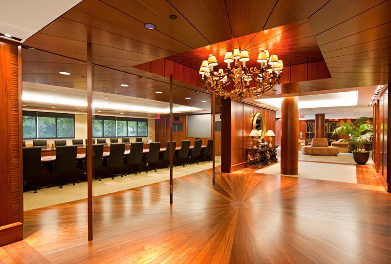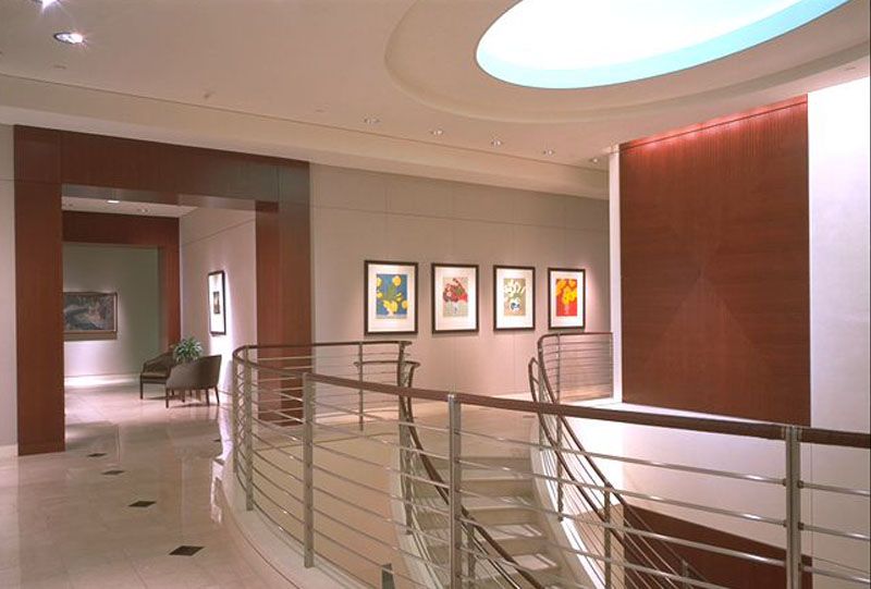 Three floor 75,000 SF Exquisite build out in new building. Radiused monumental staircase built from poured in place concrete. Includes both corporate offices and private offices of a family owned corporation.